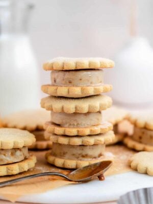 These homemade ice cream sandwiches are made with two soft-baked sugar cookies and a scoop of dairy-free caramel ice cream in the middle! In this combo, we marry the classic holiday cut-out cookie with a beloved summer-filled treat.